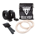 Anneaux de gymnastique en bois incluant un sac de transport, sangles de sécurité et support de porte