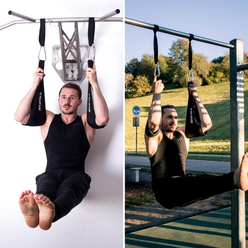 Les boucles d'entraînement abdominal conviennent à tous les types de barres de traction - que ce soit au mur, au plafond, aux cadres de porte ou aux barres fixes dans les parcs degymnastique suédoise.