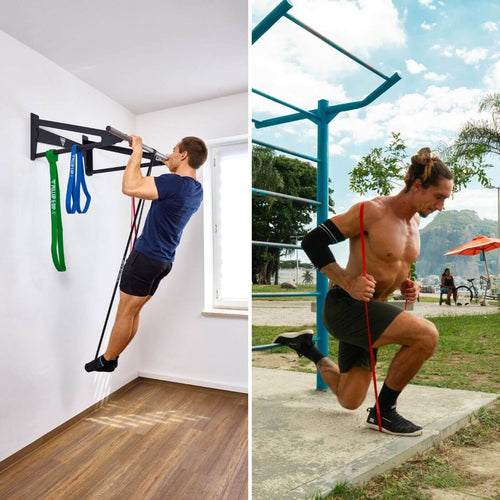 - Set de bandes de résistance avec quatre épaisseurs (rouge, noir, bleu, vert), ancrage de porte et sac inclus