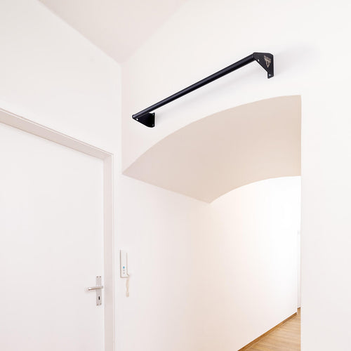 Tu as besoin d'un mur solide - par exemple en béton, en briques pleines ou en bois massif. Les cloisons sèches ou creuses ne conviennent pas. La barre est solidement vissée au-dessus du cadre de la porte.