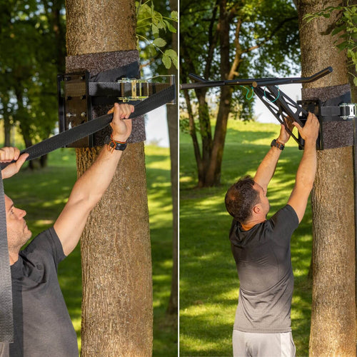 Montage à la fois unique et très stable sur un arbre ou un poteau au moyen d'un tapis de protection, d'un adaptateur outdoor et d'une sangle de serrage. Les barres enfichables permettent le transport dans un sac à dos jusqu'à ton lieu d'entraînement préféré.