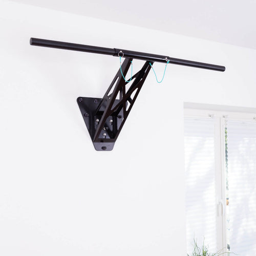 La conception inclinée unique permet de passer des tractions aux dips en quelques secondes . La barre peut être retirée du mur et rangée après l'entraînement. L'adaptateur mural peut être dissimulé par exemple par un tableau lorsqu'il n'est pas utilisé.