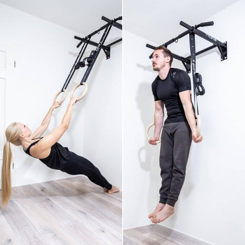 Extrêmement polyvalente comme barre de traction, pour les abdominaux ou comme fixation pour les anneaux de gymnastique pour les dips d'anneaux ou les rames. Entraîne toute la musculature de tes bras, de tes épaules, de ton ventre et de ton dos.